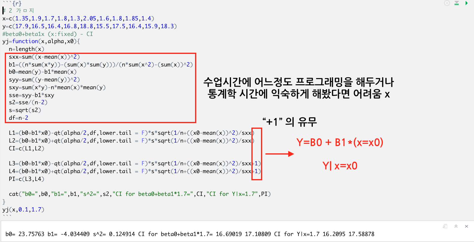 (beta 0 , beta 1, s^2, "C.I for y=Beta0 + Beta1*(1.7)", "C.I for Y|x=1.7") 이 값들을 프로그래밍의 값으로만 나오게 하면 됩니다