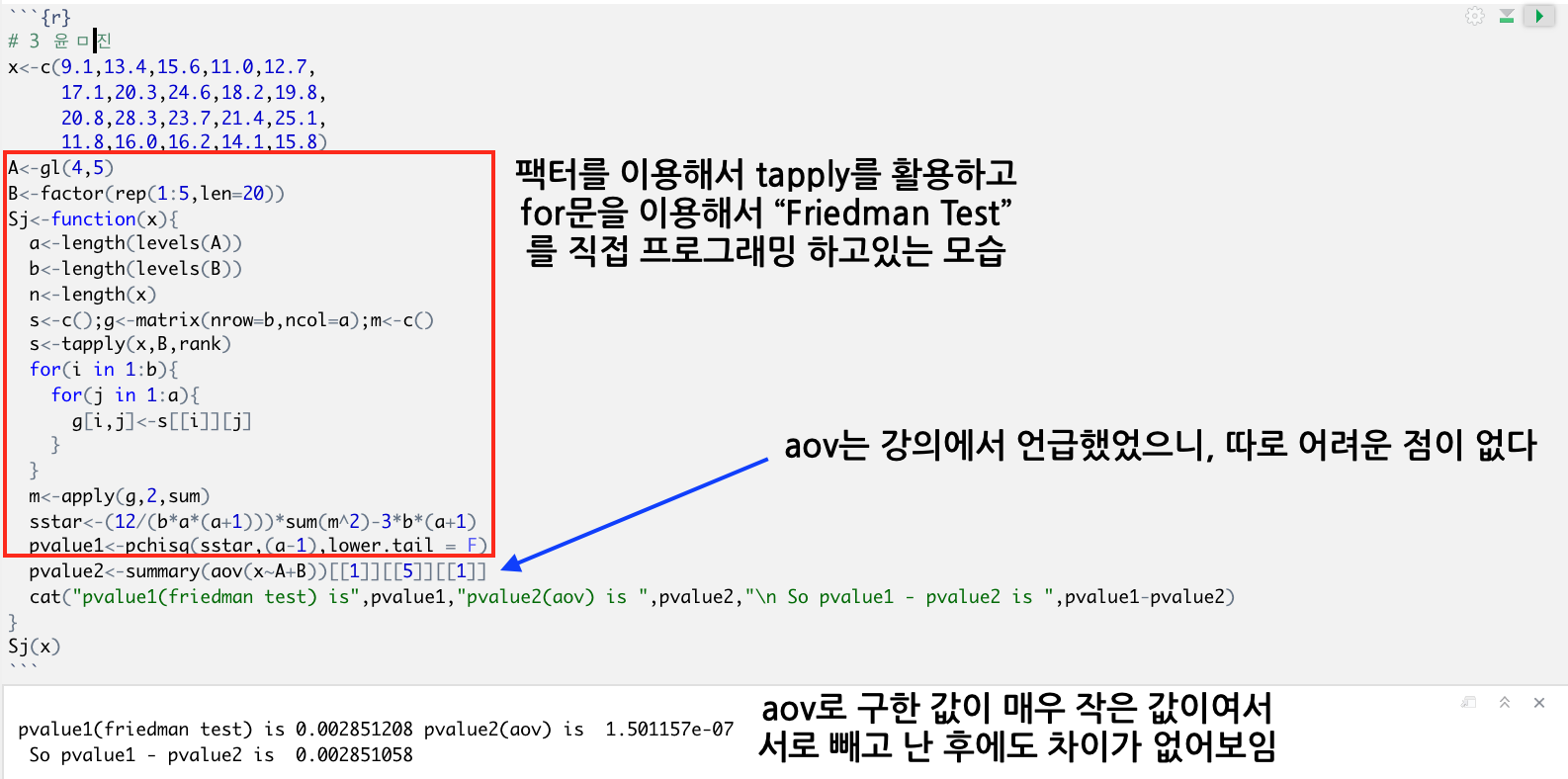 (a). 주어진 데이터를 이용해서 "Friedman Test" 를 직접 코딩하여서 p-값을 도출하고, "aov (R 자체함수)" 를 이용해서 p-값을 도출하세요, 따라서 두 개의 p-값을 구하면 됩니다 (7점)