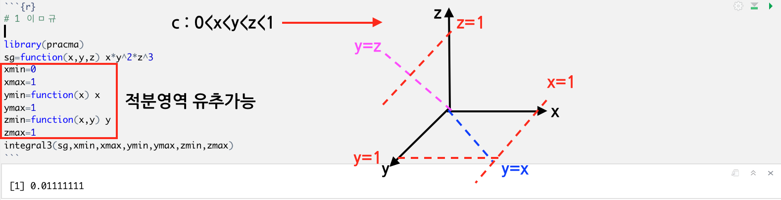 1번) 지정한 영역에 대해서 삼중적분을 실행한 값을 구하세요, f:x*y^2*z^3 ,C:0<x<y<z<1 (5점)